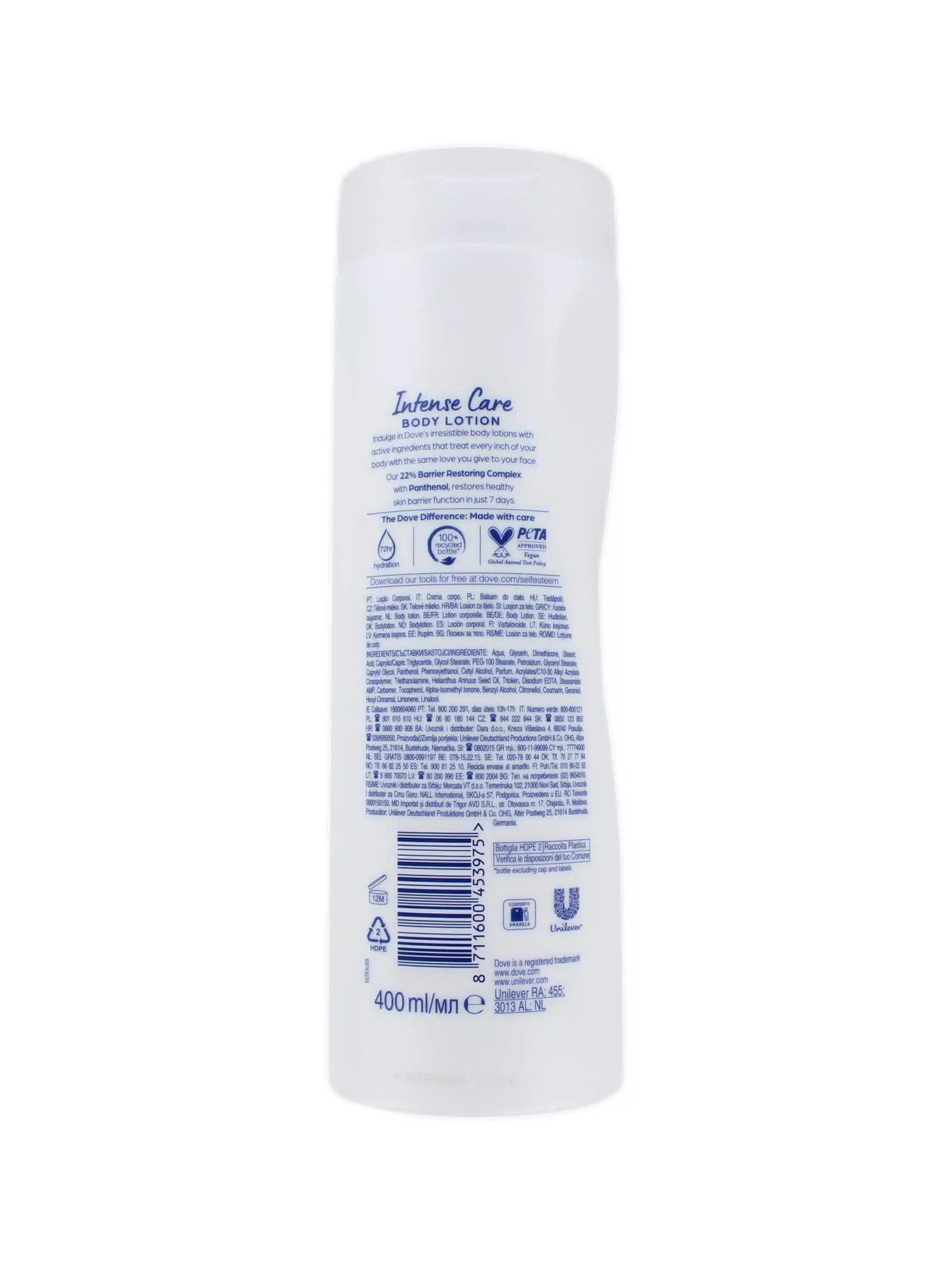 De zorgvuldig samengestelde formule van Dove Intense Care Bodylotion belooft een effectieve aanpak van ruwe en droge plekken, door de natuurlijke vochtbarrière van je huid te versterken. Met een inhoud van 400 ml biedt deze bodylotion een langdurige verzorging, zodat je minder vaak hoeft te smeren en meer tijd overhoudt voor de dingen die jij belangrijk vindt. De lotion smeert gemakkelijk uit, wordt snel opgenomen en laat geen vettig laagje achter, waardoor je je direct na het aanbrengen kunt aankleden.