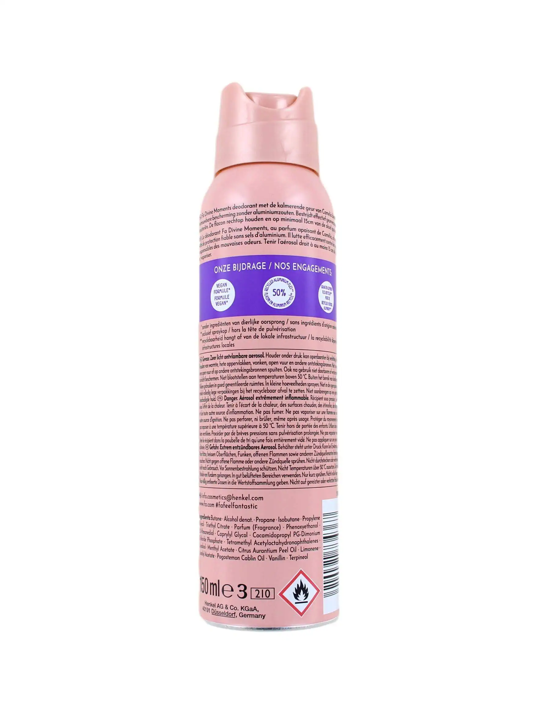 Fa Divine Moments Spray is uitgebreid dermatologisch getest om te verzekeren dat het zelfs geschikt is voor jouw meest delicate huid. Wat dit product onderscheidt, is het ontbreken van aluminiumzouten, een bewuste keuze voor jouw gezondheid en welzijn. Met elke toepassing van deze deodorant omhul je jezelf met een betoverende geur die ontworpen is om je zintuigen te verheffen en een stempel van luxe op je dag te drukken.