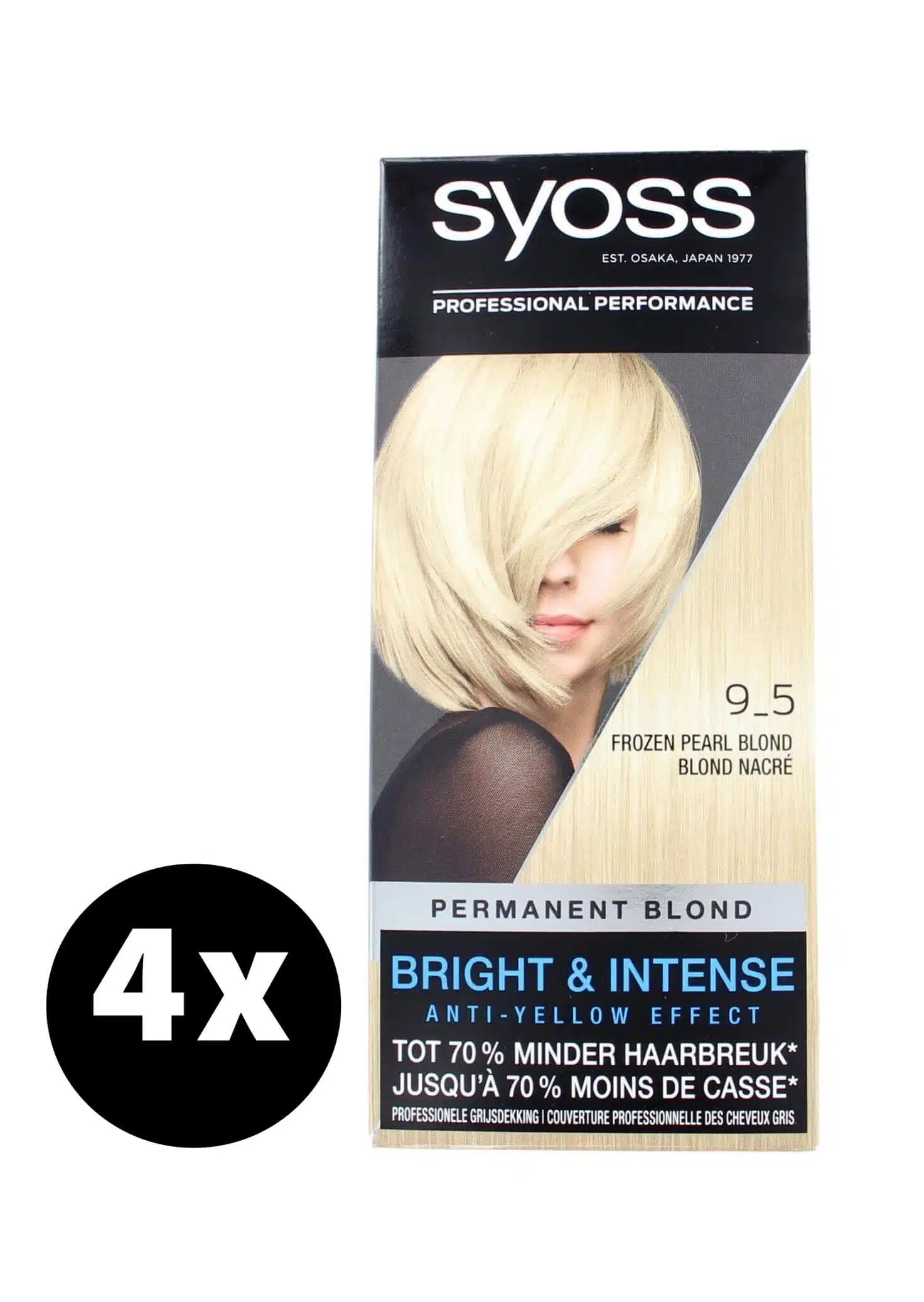 Transformeer je blonde lokken thuis met Syoss Haarverf 9-5 Frozen Pearl Blond x 4, de keuze voor een blijvend koele en stralende blondtint. Dit product, gespecialiseerd in het creëren van de begeerde Syoss Frozen Pearl Blond kleur, belooft salonkwaliteit met het gemak van een thuiskleuring. De geavanceerde formule zorgt voor een duurzame kleur die de natuurlijke haartextuur respecteert en de ultieme grijze dekking biedt.