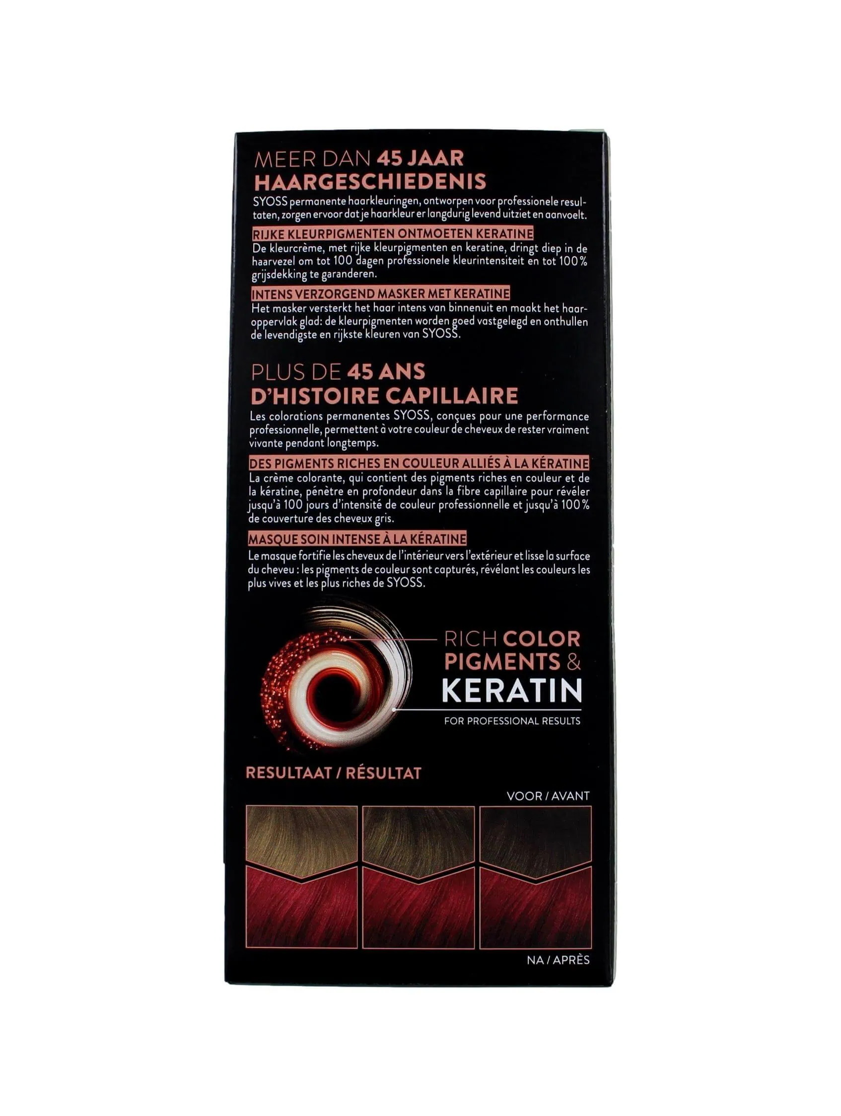 Syoss Haarverf 5-29 Intensief Rood. De kleurpigmenten van Syoss dringen tot diep in het haar door. Tot 10 weken kleurintensiteit en een professionele grijsdekking. De intense verzorging zorgt voor minder haarbreuk (tot wel 80%). De keratine zorgt voor een gladder & sterker haaroppervlak.